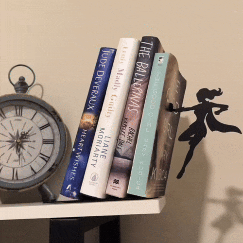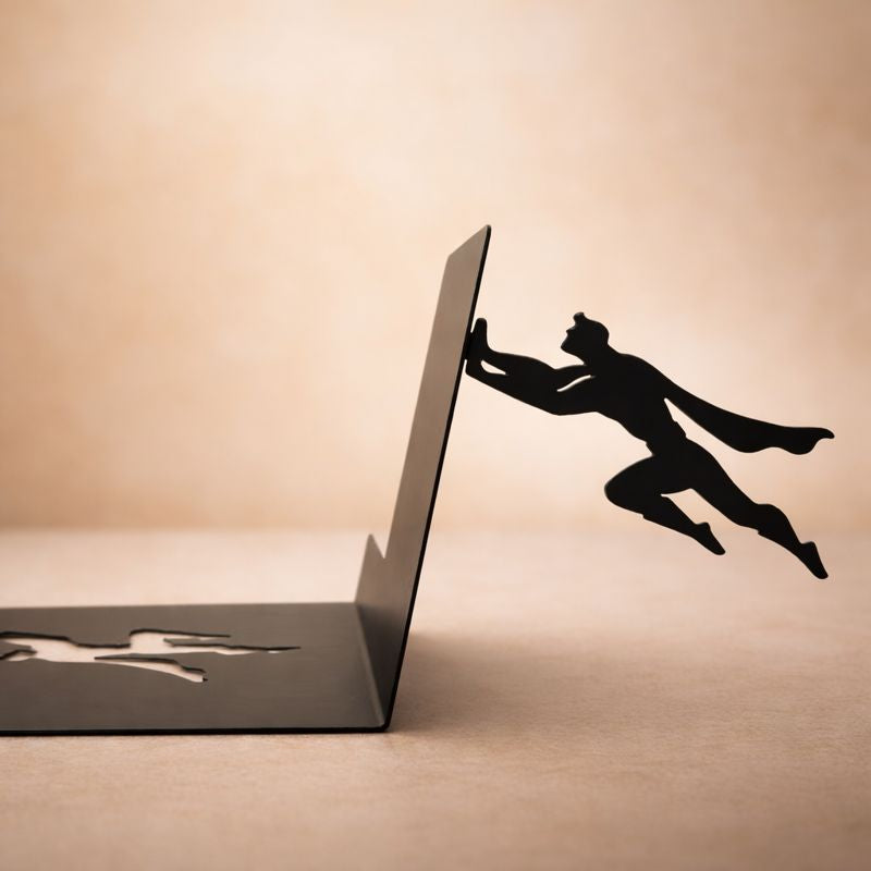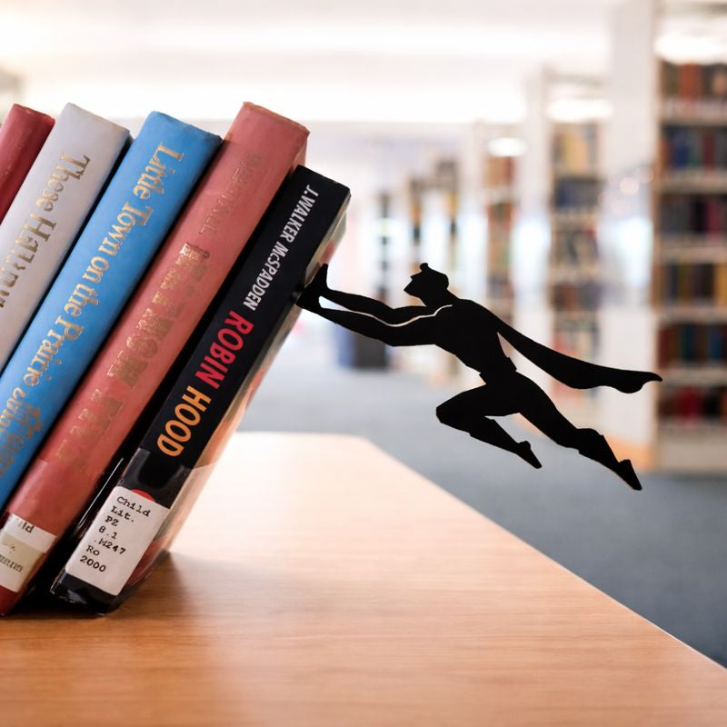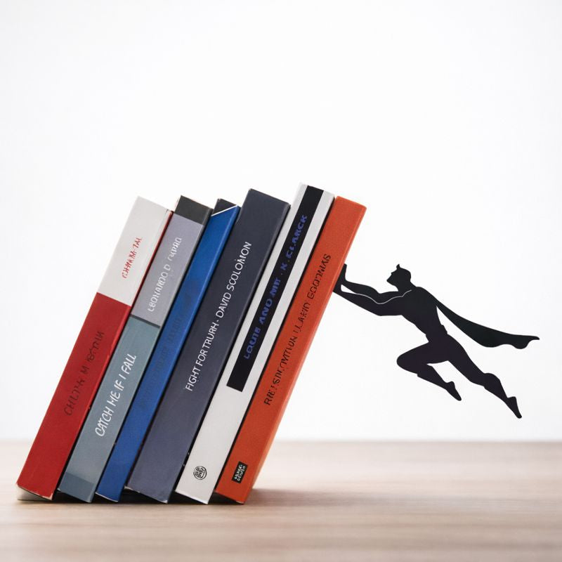 Ett bokstöd som ser ut som en superhjälte som räddar dina böcker – tack vare en smart magnetlösning.